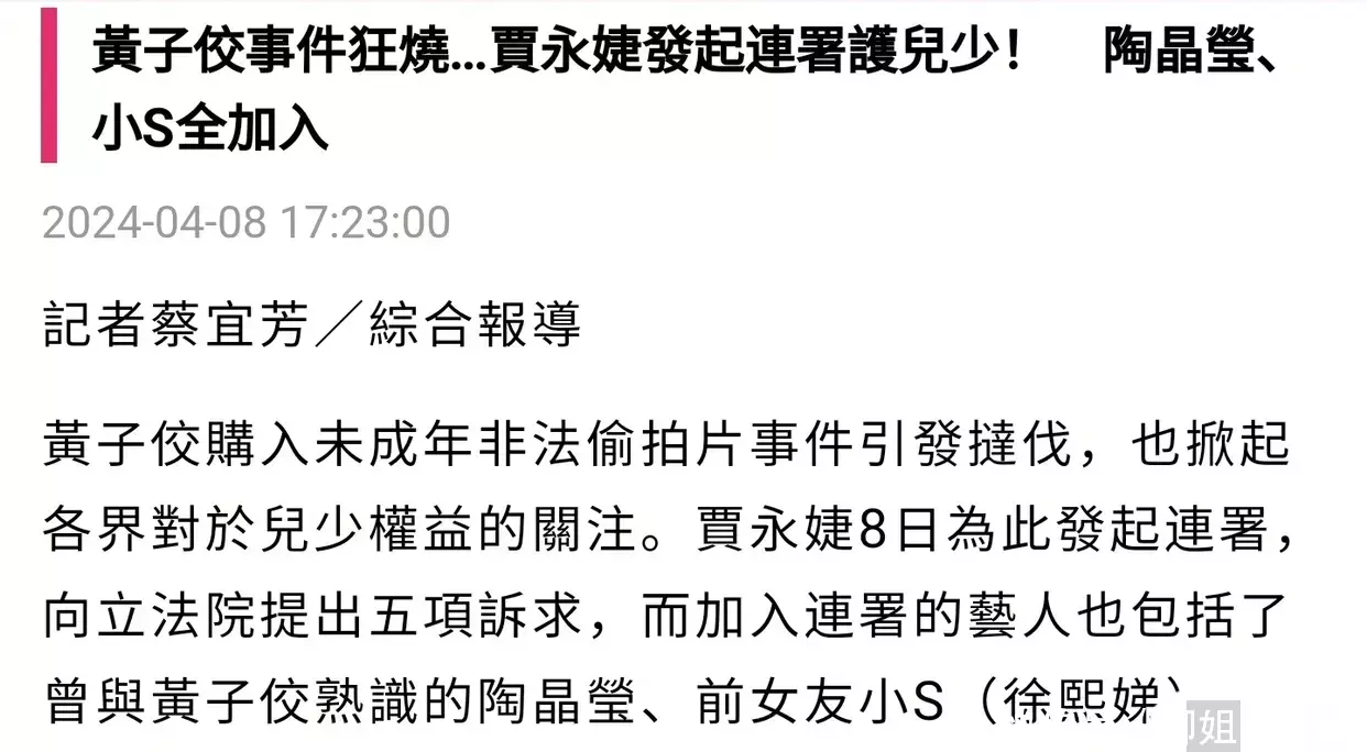 皇冠账号事件缘故是黄子佼被曝出性杂沓词语未成年女孩,随后又被扒出购入未成年偷拍片几百部,这事件短暂掀翻各界关于未成年职权的轻柔,包括小S、贾永捷、隋棠、蓝心湄在内的多位艺东说念主今天发起联名,条目关联部门开荒对未成年更安全的保护网,为未成年职权发声。